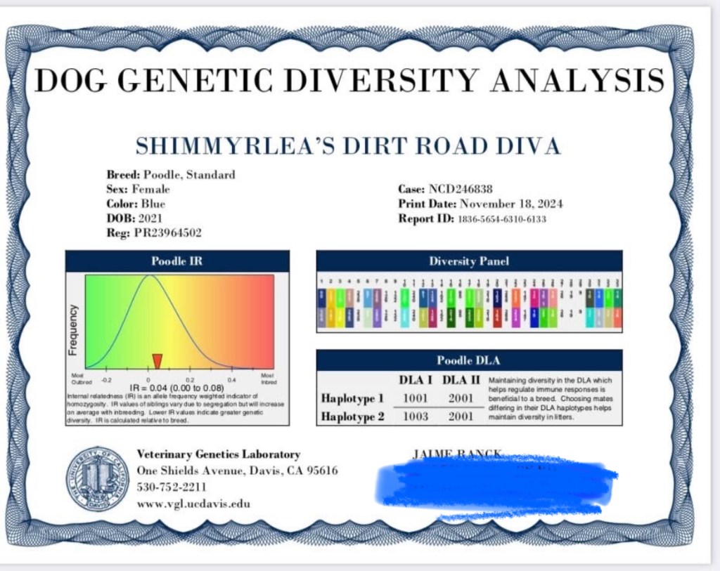 Breezy is fully health tested beyond CHIC standards, clear for poodle related genetics through Embark, VGL diversity tested, and listed on better bred.